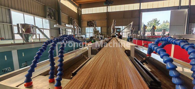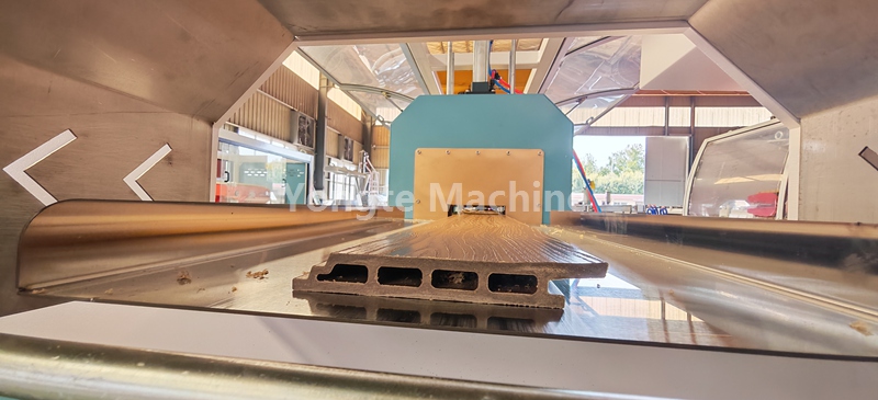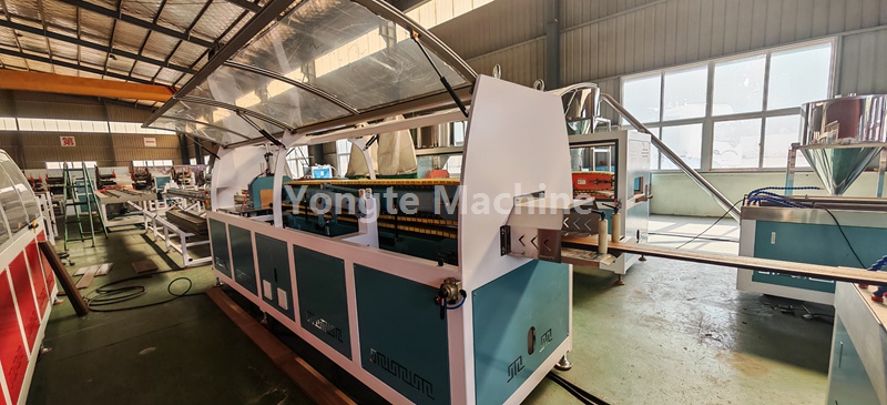Ova linija za ekstruziju WPC profila opremljena je automatskim vakuumskim sistemom za dovod, visoko efikasnim konusnim sistemom za ekstruziju sa dva vijka, PLC kontrolnim sistemom, online 3D mašinom za utiskivanje, vodenim i vakuumskim hlađenjem i stolom za kalibraciju, dvostrukim izvlačenjem gusenice, automatskom mašinom za sečenje sa sakupljačem prašine i slagačem proizvoda.