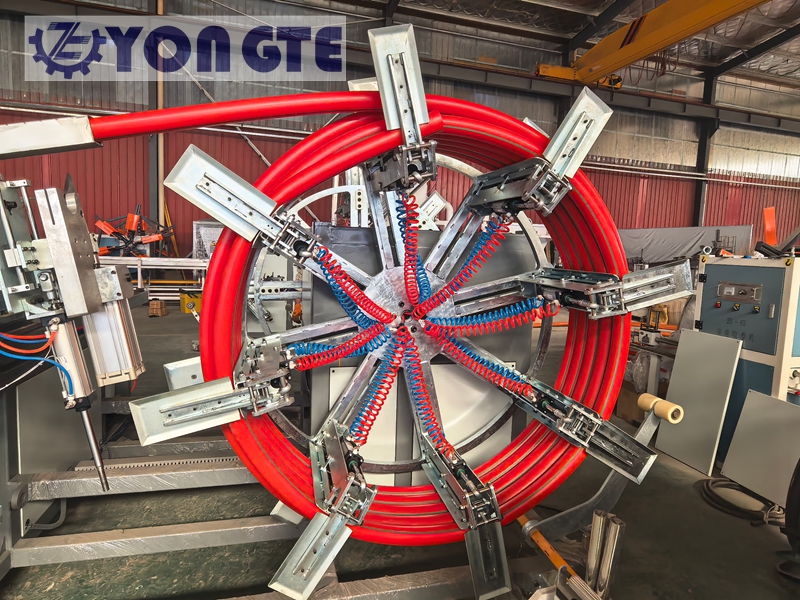 Kako bi odgovorila na ovaj izazov, Yongte Plastics Machinery, oslanjajući se na dugogodišnje iskustvo u industriji i kroz stotine optimizacija rješenja i otklanjanja grešaka u stvarnim mašinama, uspješno je razvila namjensku mašinu za namotavanje PE cijevi velikog prečnika. Ova oprema postiže napredak u tri ključna područja: Prvo, ojačana konstrukcija za teške uslove rada povećava nosivost za 50% u odnosu na tradicionalne modele, omogućavajući stabilno rukovanje cijevima promjera od 315 mm do 1200 mm. Drugo, ima inteligentni sistem dinamičke kontrole napetosti koji drži greške u kontroli napetosti unutar ±2%, fundamentalno rješavajući probleme labavih i naboranih cijevi. Treće, njegov inovativni fleksibilni dizajn valjka za namotavanje značajno smanjuje površinska oštećenja cijevi, povećavajući stopu kvalifikacije proizvoda na preko 99,5%.